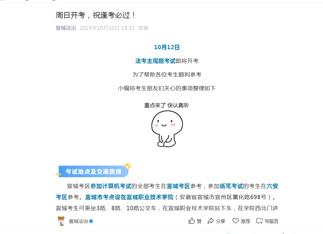 10月12日13时,长达4小时的2025年度国家法律职业资格(主观题)考试顺利落下帷幕。本次宣城考区“法考”主观题考试考点设在宣城职业技术学院。