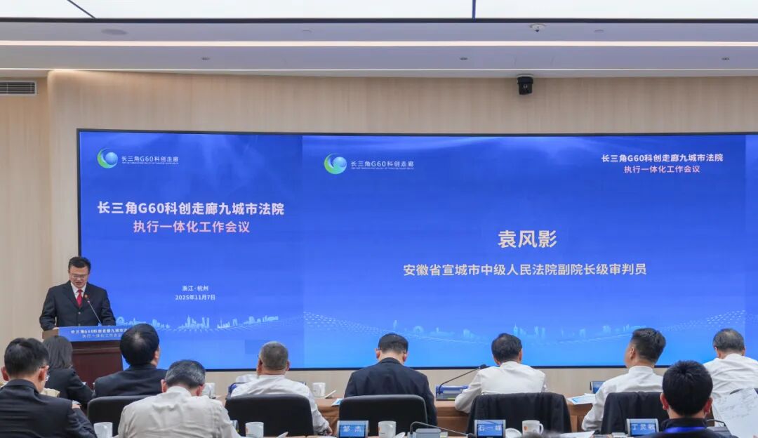 为充分发挥执行职能作用,不断加强执行互助协作,建立健全长三角G60科创走廊九城市法院交叉执行协作机制。近日,长三角G60科创走廊九城市法院执行一体化工作会议在浙江省杭州市召开,宣城市中院参加本次会议,并作经验交流发言。本次会议由浙江省高级人民法院指导、杭州市中级人民法院主办,旨在深入贯彻落实长三角一体化发展国家战略,深化跨区域司法协作,合力破解“执行难”问题。