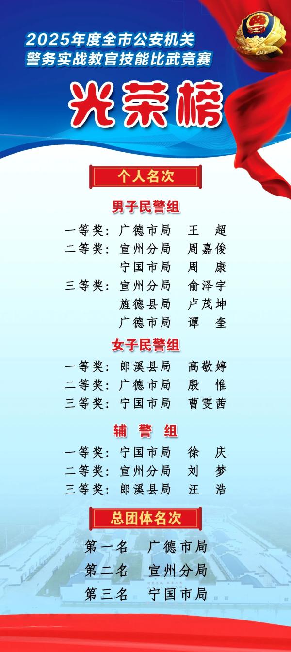此次比武竞赛为全市公安警务实战教官搭建了展示风采、淬炼本领的优质平台,有效激发了广大教官钻研实战教学、提升专业能力的积极性,营造了“示范引领、标杆带动”的良好氛围。宣城公安将以此次比武为新起点,持续加强教官队伍建设,推动竞赛成果转化为维护社会安全稳定的实际战斗力,为平安宣城建设贡献更加坚实的公安力量。