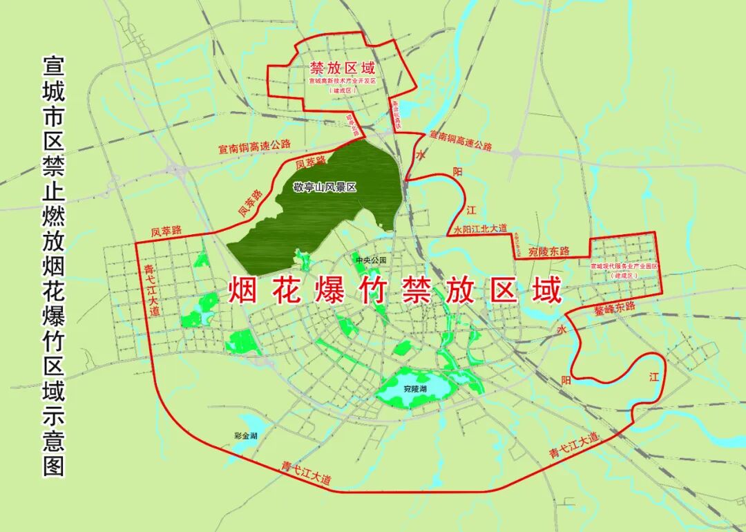 一、《宣城市燃放烟花爆竹管理条例》规定:市、县(市、区)城市建成区内禁止燃放烟花爆竹。宣城市区禁放区域为:鳌峰东路、水阳江、青弋江大道、凤萃路、昭亭北路、宣城高新技术产业开发区建成区、商合杭高铁、宣南铜高速、水阳江、水阳江北大道、水阳江东大道、宛陵东路和宣城现代服务业产业园区建成区合围区域。