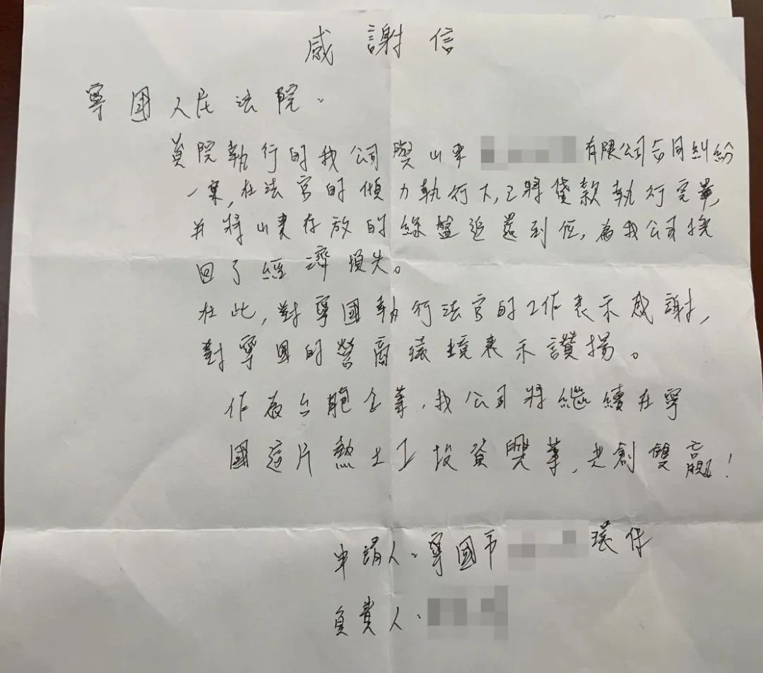近日,宁国市法院收到一封来自当事人叶某的信件,执行法官认真读着这封用繁体字书写的感谢信,字里行间流露出的,既有对法院执行工作的认可,也有对宁国营商环境的肯定。