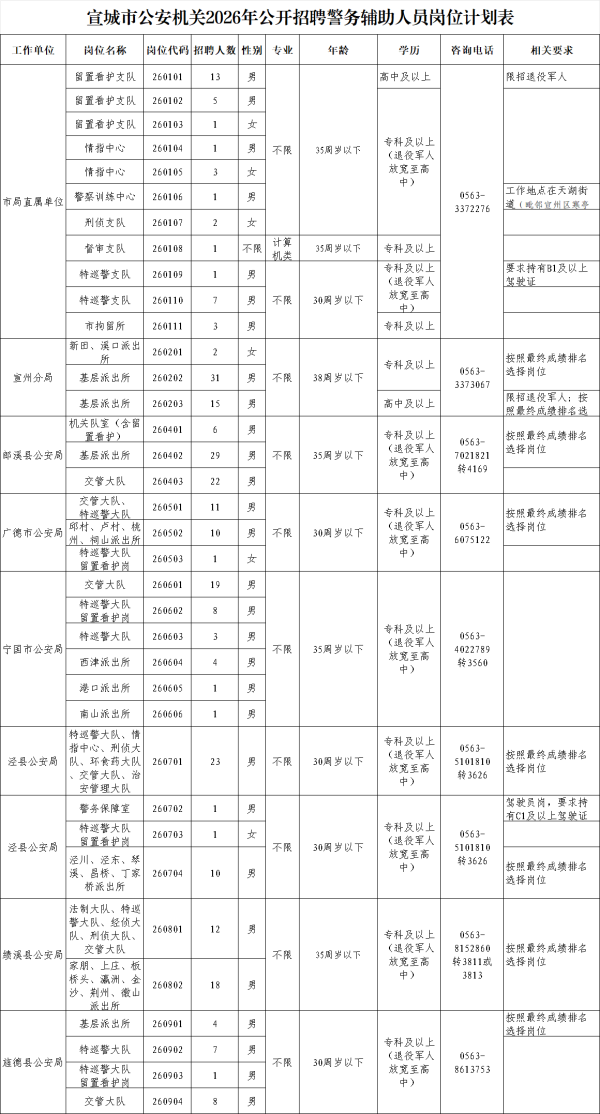 附件:宣城市公安机关2026年公开招聘警务辅助人员岗位计划表
