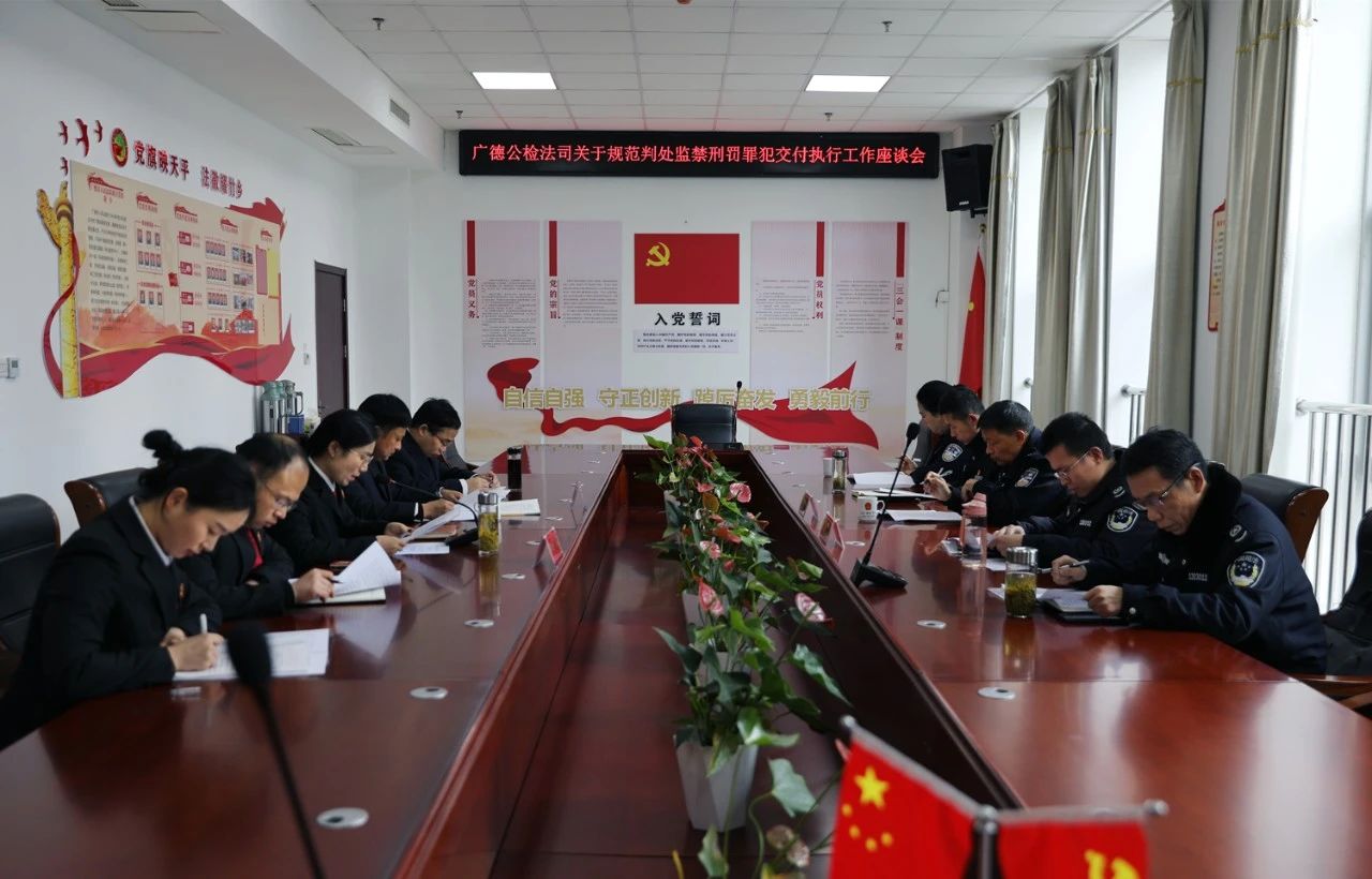 为进一步加强刑罚交付执行工作的规范化、高效化,2025年2月26日上午,广德市检察院、市法院、市公安局、市司法局“同堂培训”,聚焦判处监禁刑罚罪犯交付执行工作。四单位相关业务条线分管领导及负责同志出席座谈会。
