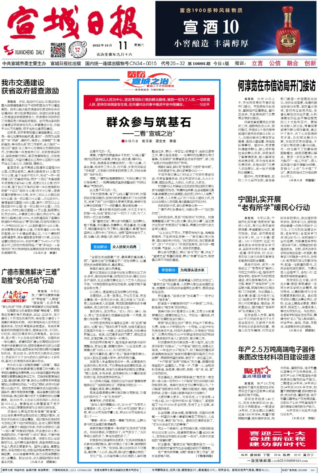 群众参与筑基石,群众“参与”的广度,决定了“宣城之治”根基的深度;群众“共建”的合力,筑成基石牢不可破的基座。