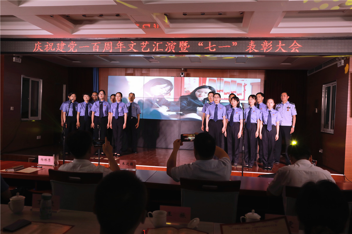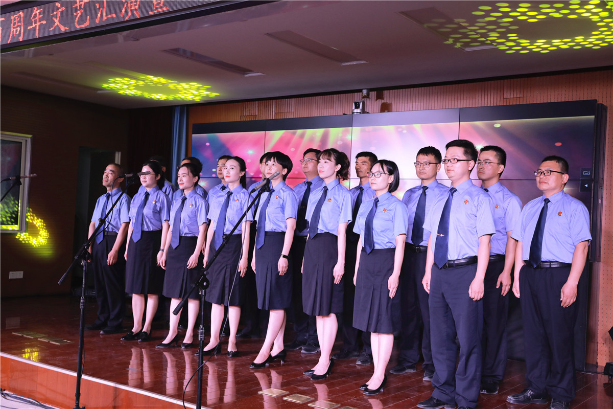 在观众的期待和掌声中,文艺汇演拉开序幕。机关三个党支部先后带来的大合唱《我们走在大路上》《没有共产党就没有新中国》《不忘初心》轮番登场,舞蹈《祖国祖国》《万疆》首尾呼应,党员干警把最深情的歌声和最动人的舞姿颂献给了我们敬爱的党,祝福未来充满希望,祝福明天更加灿烂辉煌。